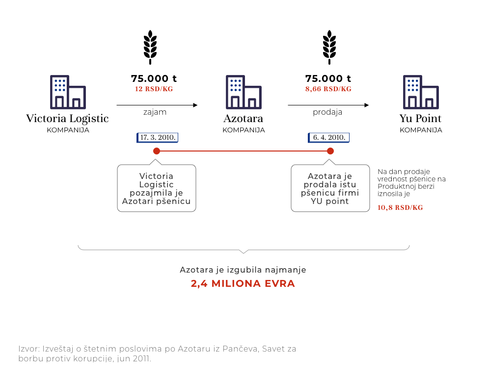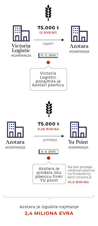 Analizom su obuhvaćena dva ugovora o robnom zajmu – između Azotare i preduzeća Victoria logistic od 17. marta 2010. i između Azotare i preduzeća YU point, od 6. aprila 2010. Azotara je od Victoria logistic pozajmila pšenicu po jednoj ceni, a onda je, dvadesetak dana kasnije, prodala preduzeću YU point biznismena Zorana Drakulića, po mnogo nižoj.