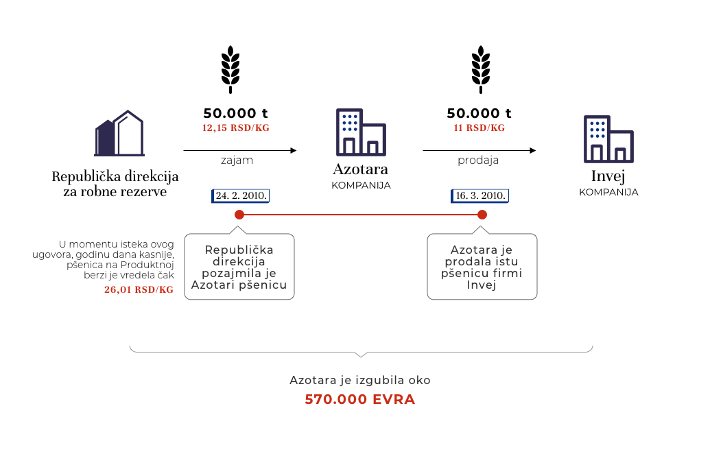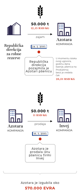 Tri nedelje od pozajmice, Azotara je pšenicu prodala preduzeću Invej po ceni od 11 dinara za kilogram, odnosno za ukupno 550 miliona dinara, sa odloženim rokom plaćanja. Na toj razlici, Azotara je izgubila 57 miliona dinara, odnosno oko 570.000 evra.